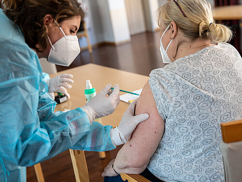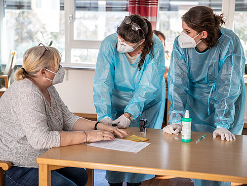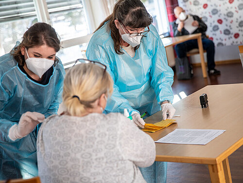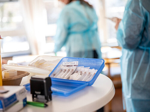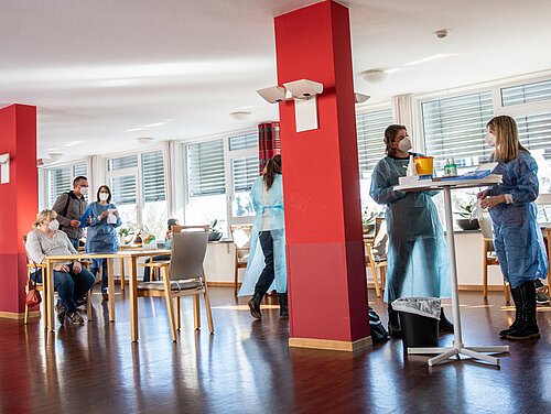 In dem lichtdurchfluteten Aufenthaltsraum ist schon alles vorbereitet. Zehn Tische mit je zwei Sitzplätzen sind arrangiert. Desinfektionsmittel, Handschuhe, Kanülen, Pflaster und Tupfer liegen auf einem Stehtisch im vorderen Teil des hellen Raumes und warten, benutzt zu werden. Nacheinander kommen die ersten vier Mitarbeiter des Altenheims rein und setzen sich an die Tische, während die beiden Ärzteteams um Ärztin Birgit Amthauer und Ärztin Lisa Balles sich bereit machen, Handschuhe überziehen und an die Tische treten. Ruhig und routiniert wirkt der Ablauf.