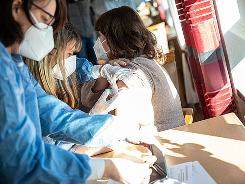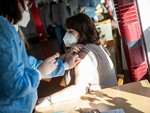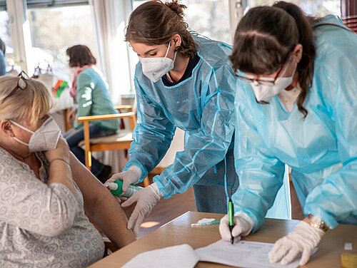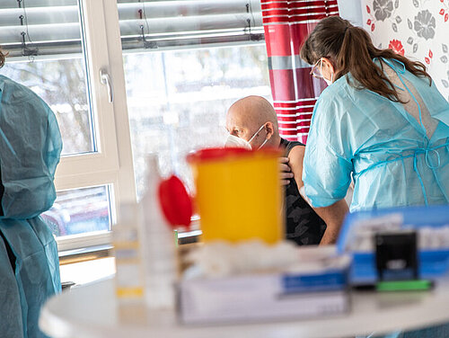 Die Mitarbeiter, die schon im Januar geimpft worden, haben die Impfung gut vertragen, manche haben nach der Zweitimpfung leichtes Fieber bekommen, erklärt die Einrichtungsleiterin und bittet ihre Mitarbeiter ins Nebenzimmer. Es ist 14.30 Uhr, die Impfdosen sind fertig. Während das Ärzteteam bereits in den Wohnbereichen unterwegs ist und dort Impfungen an die Bewohner verteilt, geht es auch unten fürs Personal des Heims los.