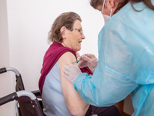 Einen Tag nach Neujahr war das Team bereits schon mal da. 80 Impfdosen hatte es dabei, 50 gingen an die Bewohner, der Rest wurde auf die Mitarbeiter aufgeteilt. Die Zweitimpfung in diesen Fällen ist bereits geschafft, an diesem Samstag sind die diejenigen dran, für die am Anfang nicht genügend Impfstoff da war.