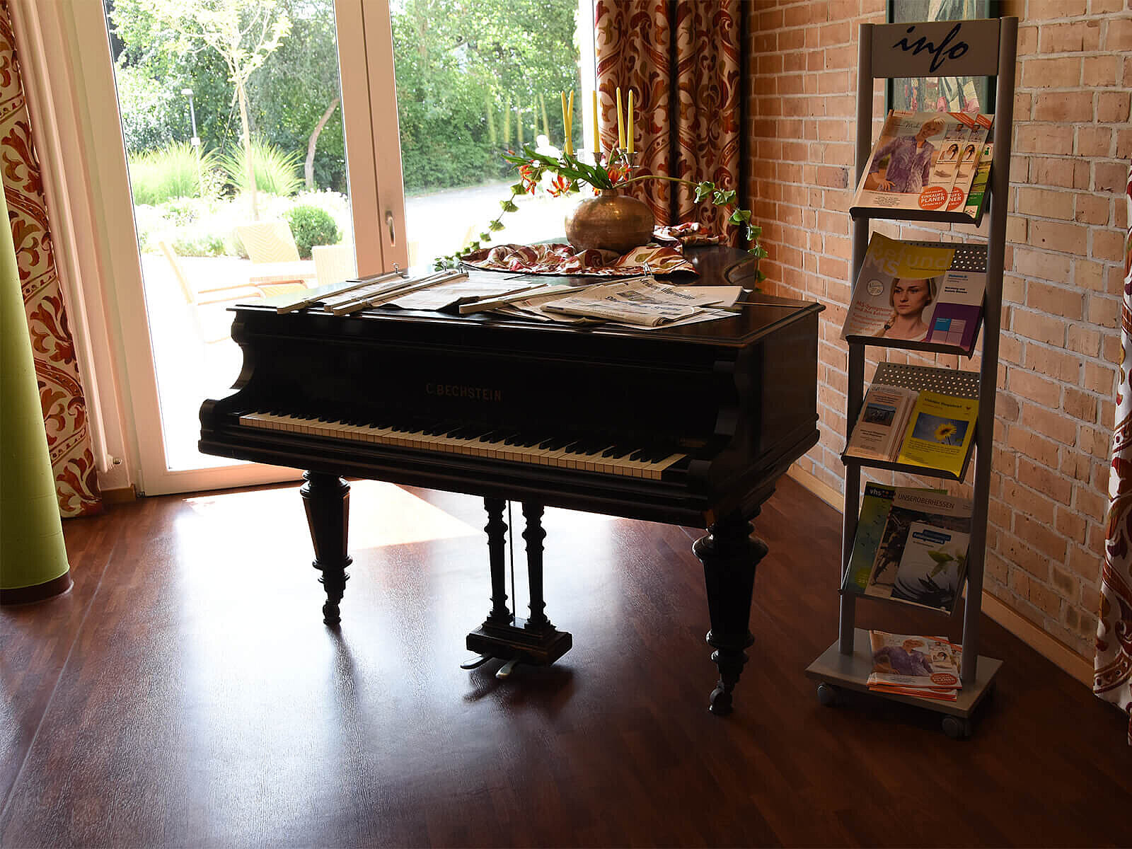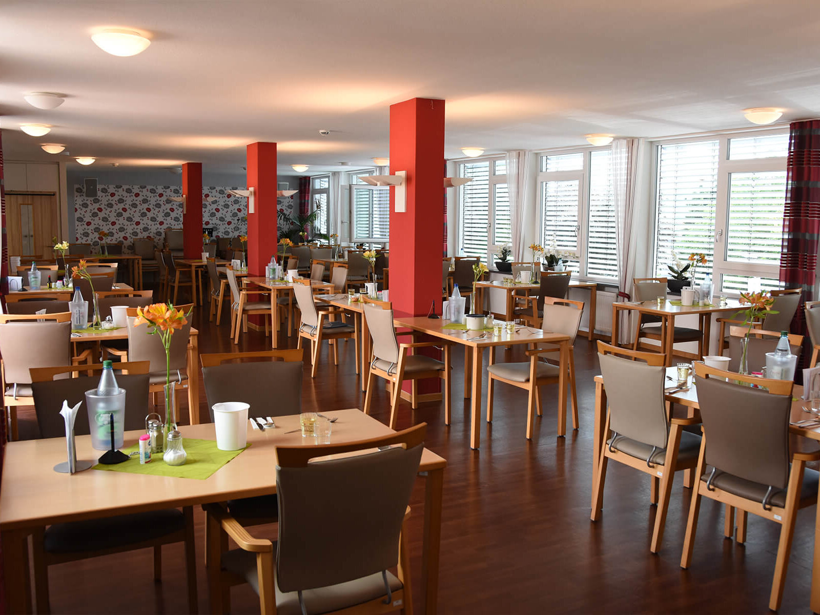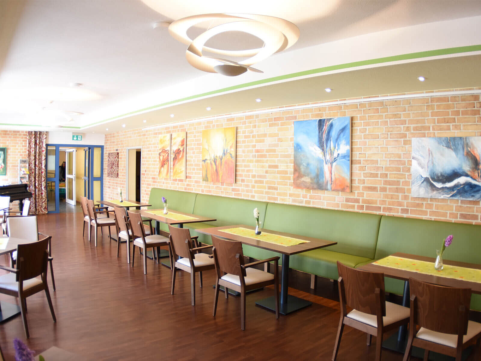 In allen öffentlichen Bereichen, in den Bewohnerzimmern, Aufenthaltsbereichen legen wir Wert auf ein entsprechendes Licht- und Farbkonzept. Bei unserer Farbauswahl orientieren wir uns an dem wissenschaftlich fundierten Farbkonzept „Farben der Gesundheit“ nach Professor Venn, mit einer guten und erfolgreichen Resonanz. Darüber hinaus setzen wir in den Aufenthaltsbereichen gezielt Tapeten ein, um ein hohes Maß an Behaglichkeit zu erzeugen. Die Ausstattung der Aufenthaltsbereiche für unsere Bewohner erfolgt nach dem Prinzip eines Wohn- Esszimmers, so wie man es von zu Hause her kennt.