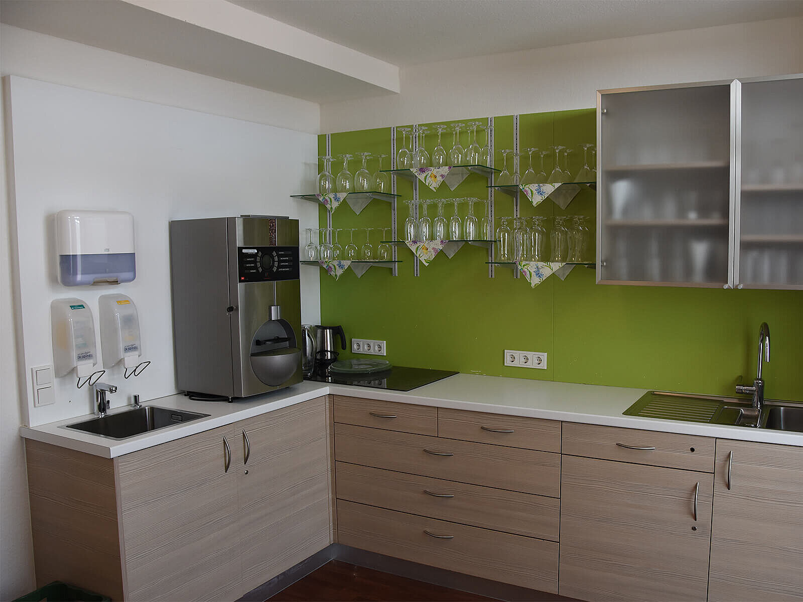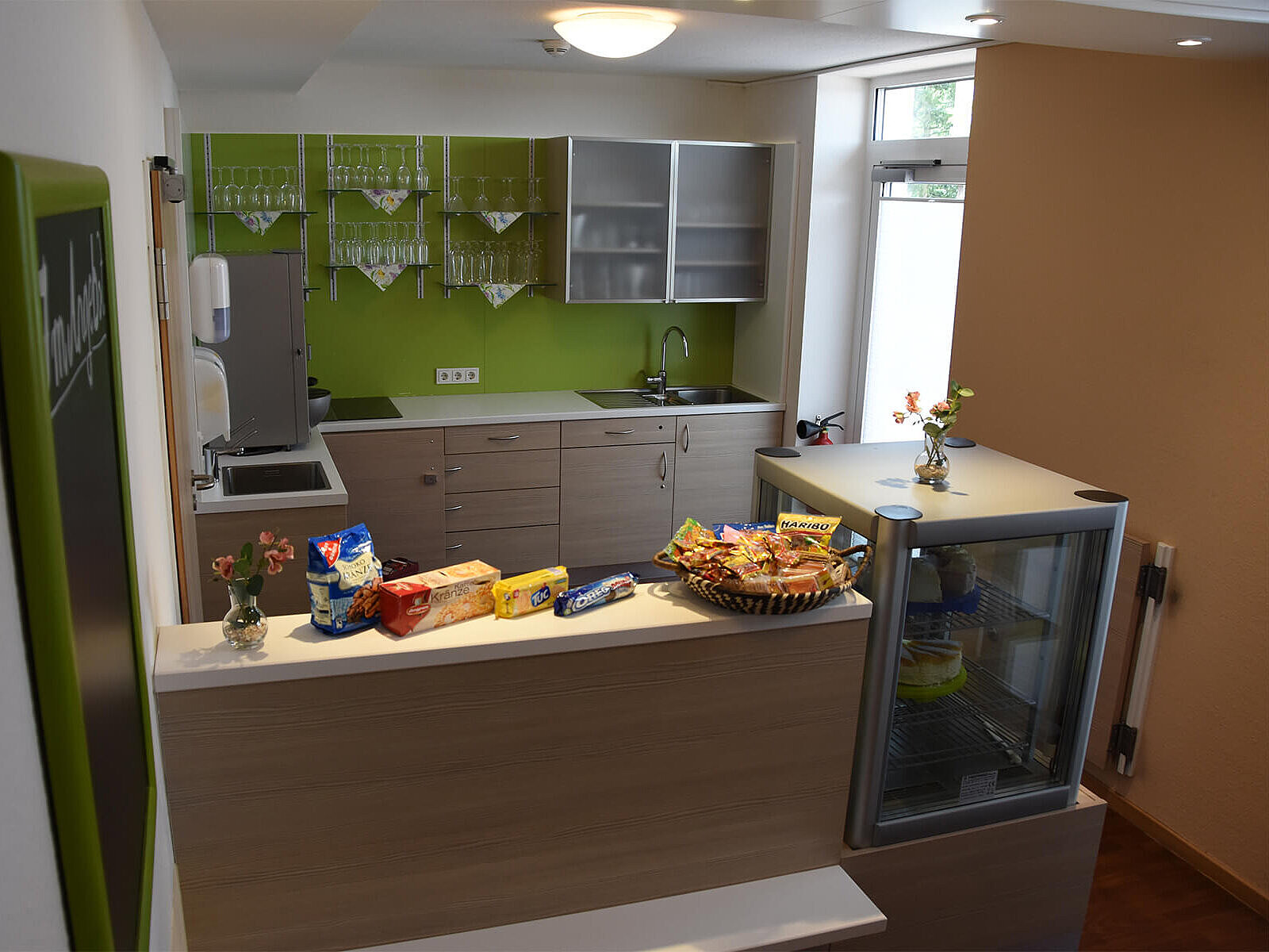 Auf jeder Etage befindet sich eine voll ausgestattete Küche. Dort wird im Rahmen von Therapie und Betreuung mit Bewohnern in Kleingruppen gebacken und gekocht.