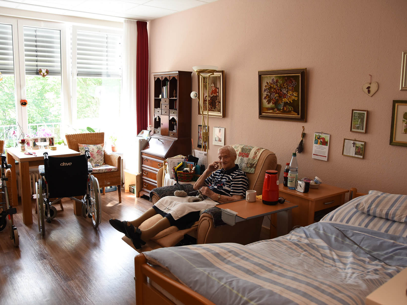Wir legen Wert darauf, dass unsere Bewohner die Zimmer ansonsten mit eigenen Möbeln, Lieblingsstücken und biografischen Erinnerungsstücken ausstatten. Dies gibt jedem Zimmer die ganz eigene persönliche Note und Individualität. Unsere langjährige Erfahrung zeigt, dass die Bewohner mit dieser Form der Möblierung sehr zufrieden sind und dies auch die Eingewöhnungsphase erleichtert. Ein Fußboden in Holzoptik und farblich abgestimmte Wände runden unsere Zimmerausstattung ab.